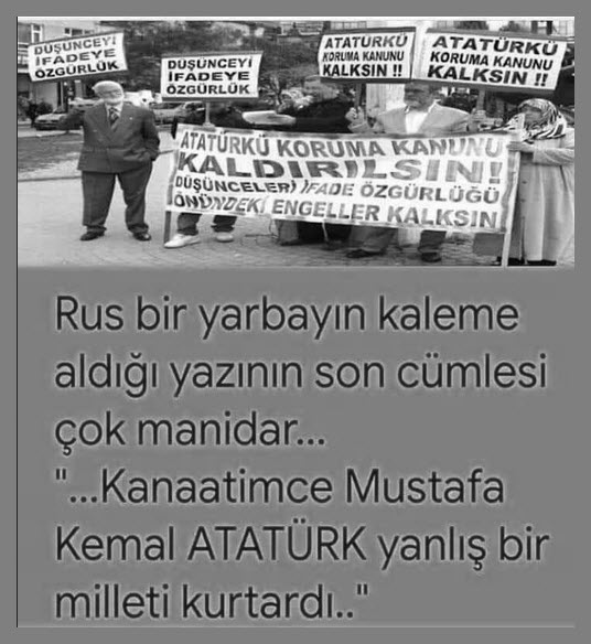Yukarıdaki fotoğrafta gözükenler ve Atatürk’e daha da rahatça hakaret etmek isteyenler acaba gerçekten Türk müdür? Bu topraklarda doğan ve kendilerine bir ülke armağan eden tüm dünyanın ve hatta düşmanlarının dahi saygısını kazanmış olan bir kahramana neden düşmanlık yapan böylesi cahil ve şeriat isteyen bir toplum vardır?