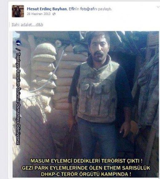 Bayhan ayrıca Gezi Parkı eylemlerinde hayatını kaybeden Ethem Sarısülük’ün tabur komutanlığında çekilen fotoğrafının terör örgütü kampında çekildiğini öne sürmüş, 28 Haziran 2013’teki paylaşımında Sarısülük’ün fotoğrafının üzerine “İlahi adalet” yazmıştı.