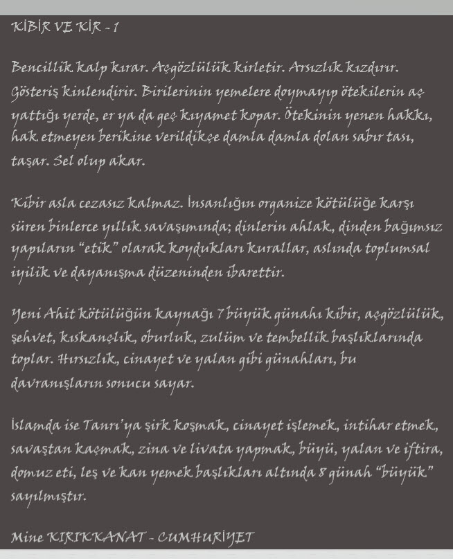 KİBİR VE KİR * İster zulmü pekiştirsinler ister kibri, hangi günah ya da suçu işlerse işlesinler, o zaman da yenilmişlerdi bu zaman da yenilecekler. Genç ve güçlü 11 kadını belediye başkanı seçen aynı halk, siyasal satranç tahtasında gericiliğe de “Şah!” çekmiştir. Yenip devirmesi de artık zaman sorunudur.