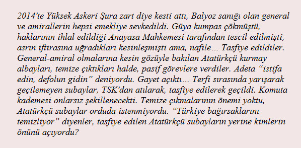Bugün görüyoruz, 103 general ve amiral, dile kolay, iki binden fazla subay-astsubay Fethullahçılıktan gözaltına alındı. Genelkurmay başkanının emir subayından, cumhurbaşkanının yaverine kadar, burunlarının dibi bile Fethullahçı çıktı..Akp’yle cemaat imam nikahlıyken, Fethullahçılara nerdeyse devletin tapusu verilmişken… MİT’e hiç sızmamış olmaları, hiç Fethullahçı MİT’çi olmaması, MİT açısından ne büyük başarı di mi? ”