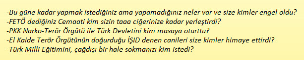 Korkmak sizin işiniz olduğuna göre, biz de yazıyla soralım, siz istediğiniz gibi yanıt verin. Nasılsa çok az bir zaman sonra, Yüce Divan’da konuşacaksınız. İsteseniz de, istemeseniz de…